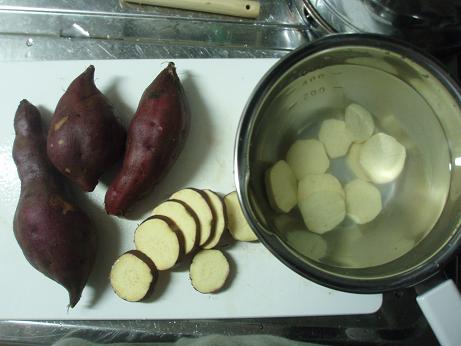洗ったサツマイモは、端の繊維の多い部分は切捨て、真ん中らへんを5mmぐらいの輪切りにします。