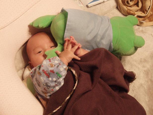 自分でスプーンを掴もうとするのは相変わらずなので、今ではママが後ろから両手をがっちり掴み、拘束された状態でパパに食べさせてもらっています(^^;)