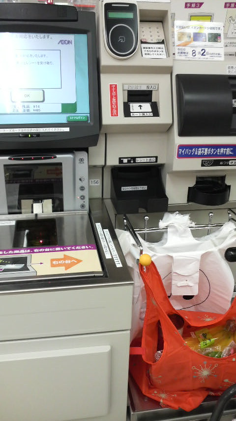 左の台にカゴを置いて、右の台に袋を置いて、自分で一つずつピッ♪